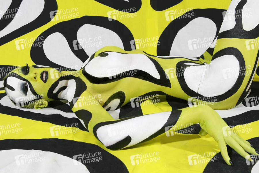 Bodypainting, Stoffdesign Anna Efverlund, Erotik, Frau, nackt, drinnen, weiblich, Muster, Chamäleon, erotic, woman, nude, indoor, female, chameleon