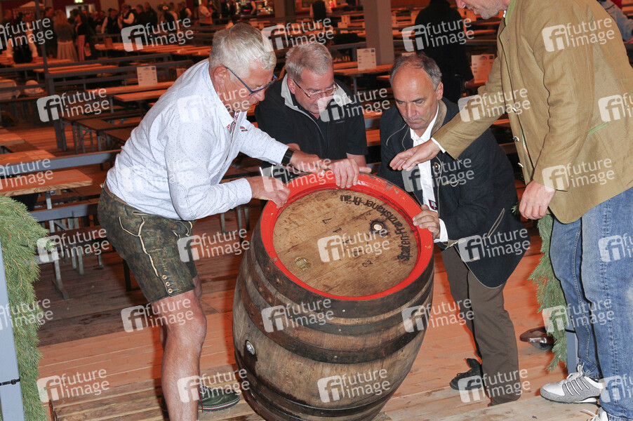 Bierfässer-Aufstellen beim Wiesn Anstich zur Eröffnung vom Oktoberfest 2019 im Schottenhamel Festzelt. München, 21.09.2019