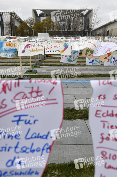 Landwirte, Klima- und Tierschützer demonstrieren unter dem Motto 'Wir haben es satt' für eine Wende in der Agrarpolitik. Vor dem Kanzleramt wird symbolisch mit rund zehntausend Fußabdrücken auf Papier eine bäuerliche, ökologische und klimafreundliche Landwirtschaft gefordert. Berlin, 16.01.2021