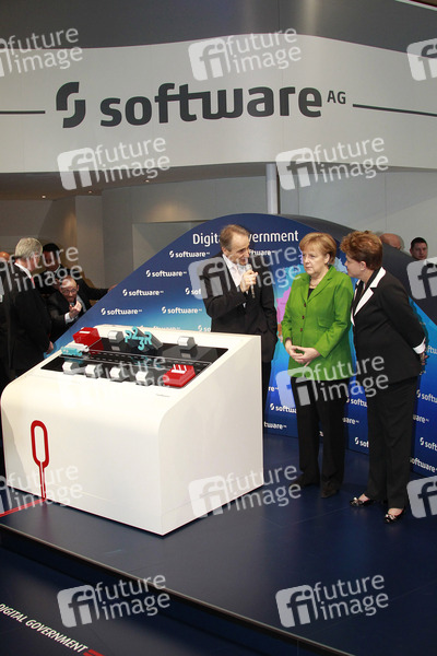 Eröffnungsrundgang von Bundeskanzlerin Merkel auf der CeBIT 2012 (Centrum der Büro- und Informationstechnik), der weltgrößten Messe für Informations- und Computertechnik auf dem Messegelände, Hannover - Am Messestand der Software AG