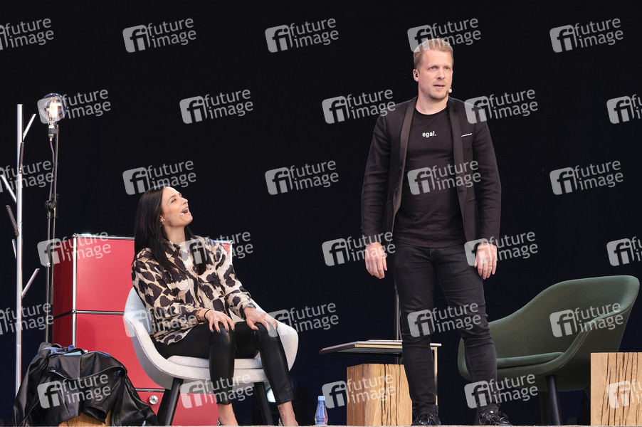 Oliver Pocher mit Ehefrau Amira Pocher bei der ersten Autokultur-Veranstaltung 'Die Pochers hier' auf dem Schützenplatz. Die Besucher verfolgen unter Berücksichtigung klarer Hygiene-Vorschriften während der Corona-Krise den Auftritt aus dem Auto. Hannover, 07.05.2020
