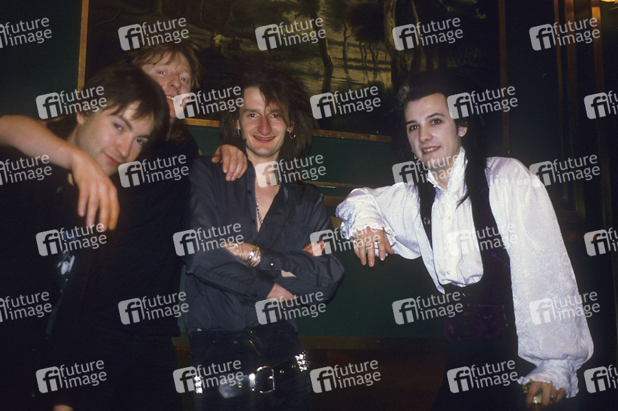 Roman Jugg, Rat Scabies, Bryn Merrick und Dave Vanian von The Damned bei einem Photoshooting in einem Hotel. London, 12.07.1985