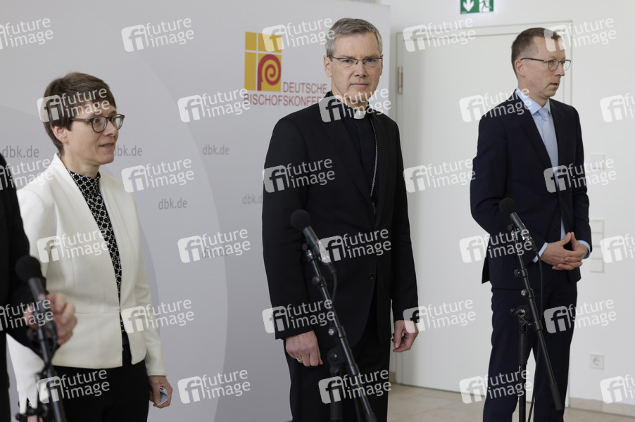 Beate Gilles, Heiner Wilmer und Matthias Kopp beim Pressestatement zur Wahl von Heiner Wilmer SCJ zum neuen Vorsitzenden der Bischofskonferenz auf der Frühjahrsvollversammlung im Burkardushaus. Würzburg, 24.02.2026