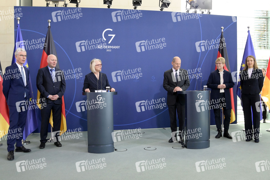 Martin Werding, Achim Truger, Monika Schnitzer, Olaf Scholz, Veronika Grimm und Ulrike Malmendier bei der Übergabe des Jahresgutachtens 2022/2023 des Sachverständigenrates zur Begutachtung der gesamtwirtschaftlichen Entwicklung an den Bundeskanzler im Bundeskanzleramt. Berlin, 09.11.2022