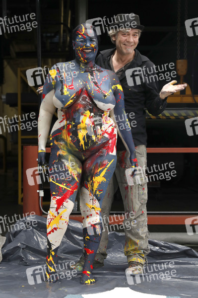 Bodyart-Künstler Jörg Düsterwald realisiert zum Thema 'Vielfältigkeit' mit verschiedenen Fotomodell-Typen eine Kunstwerk-Serie. In den Produktionshallen des kooperierenden Unternehmens Vorwerk flooring in Hameln hat er das Plus-Size-Model Nisi passend zum gesponserten Bodenbelag mit einem Bodypainting versehen und anschließend flüssige Farbspuren aufgetragen.