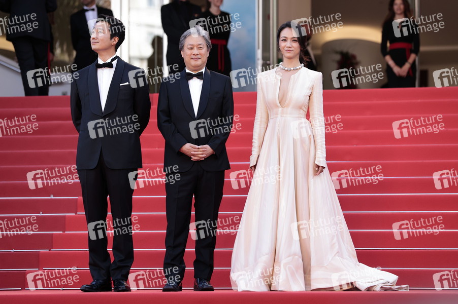 Park Hae-il, Park Chan-wook und Tang Wei bei der Premiere des Kinofilms 'Decision to Leave / Heojil kyolshim' auf dem Festival de Cannes 2022 / 75. Internationale Filmfestspiele von Cannes im Palais des Festivals. Cannes, 23.05.2022