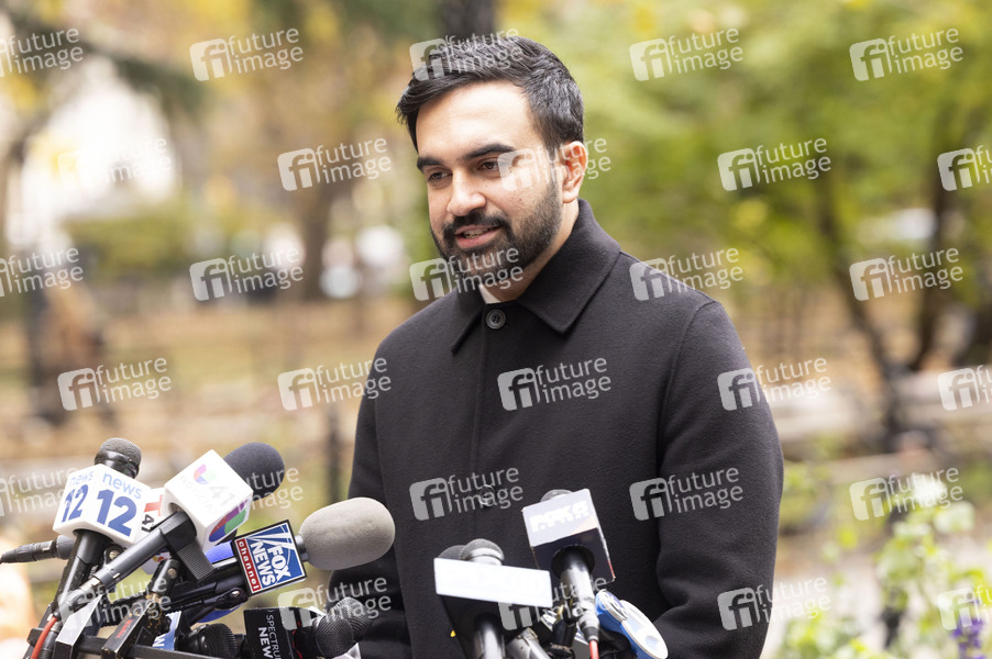 Zohran Mamdani bei einer Pressekonferenz im City Hall Park zu einem bevorstehenden Treffen mit dem US-Präsidenten in Weißen Haus. New York, 20.11.2025