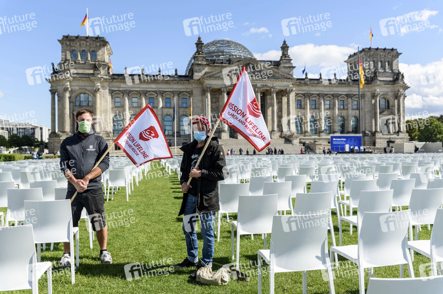 Axel Steier (re., Mission Lifeline e. V. ) - Unter dem Motto 'Wir haben Platz' stehen 13000 leere Stühle vor dem Berliner Reichstag. Mit die Aktion fordern unter anderem die Aktion Seebrücke und CAMPACT die Evakuierung griechischer Flüchtinglager und die Aufnahme von Geflüchteten. Die Stühle stehen stellvertretend für die 13000 Flüchtlinge im Flüchtingslager Moria. Berlin, 07.09.2020