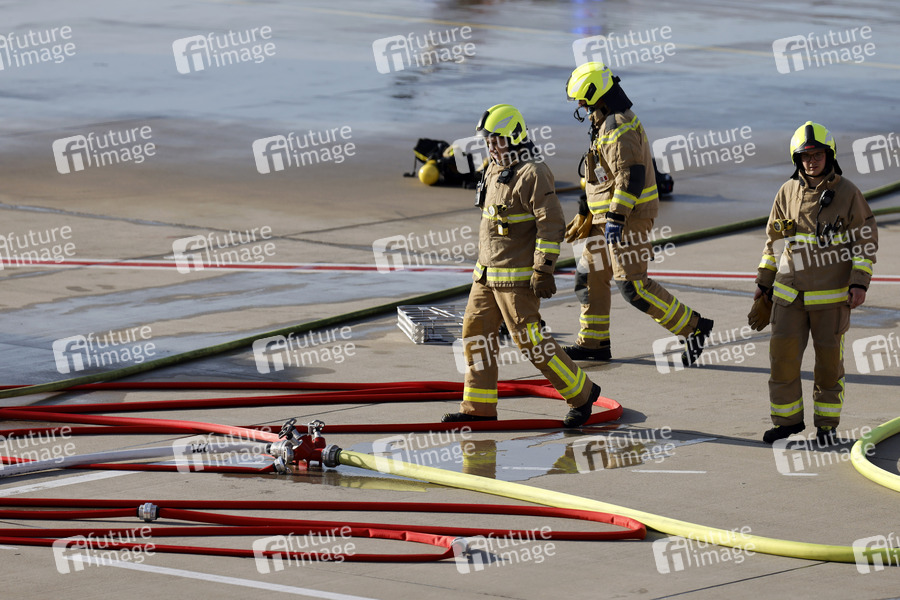 Einsatzkräftei der gemeinsamen ICAO-Notfallübung der Werkfeuerwehr, der Feuerwehr Köln, THW, Landespolizei, Bundespolizei und Bundeswehr am Köln Bonn Airport. Im Rahmen der Übung wird die Kollision eines Flugzeugs mit einem Passagierbus und einer Abfertigungshalle simuliert. Einsatzkräfte retten Verletzte aus dem in Brand geratenen Flugzeug. Köln, 06.11.2021