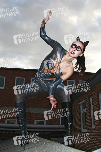 Catwoman Photoshooting mit SOLsnap-Model Elena im Hefehof-Center, Hameln. Bodypaint-Künstler: Jörg Düsterwald