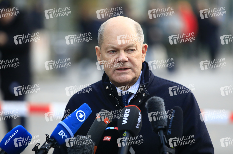 Olaf Scholz beim Pressestatement am Ort des mutmaßlichen Anschlags vom 13. Februar. München, 15.02.2025