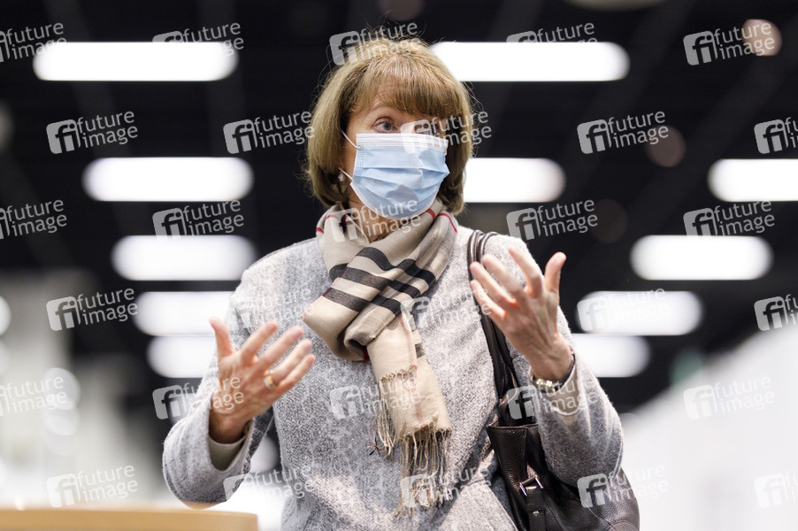 Henrietter Reker auf der Pressekonferenz: Der NRW-Justizminister auf Werbetour in Köln für die Kampagne des Weissen Rings zum Thema 'Kein Anschluss für Betrüger am Telefon' im Impfzentrum in den Messehallen. Auch dort sollen Plakate die alten Menschen vor der Enkeltrick-Masche warnen, die ohnehin die Messehallen für einen Impftermin aufsuchen. Köln, 05.02.2021