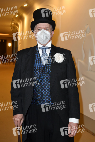 Peer Martiny beim Fototermin mit dem (getesteten) Ensemble des Theaterstücks 'Vorhang auf für Cyrano' in Maske und Kostüm vor dem Testzentrum im Schiller Theater. Unter dem Motto 'Testen statt spielen' eröffnen die Komödie am Kurfürstendamm und der KitKatclub ein gemeinsames Testzentrum im Schiller Theater. Berlin, 07.04.2021