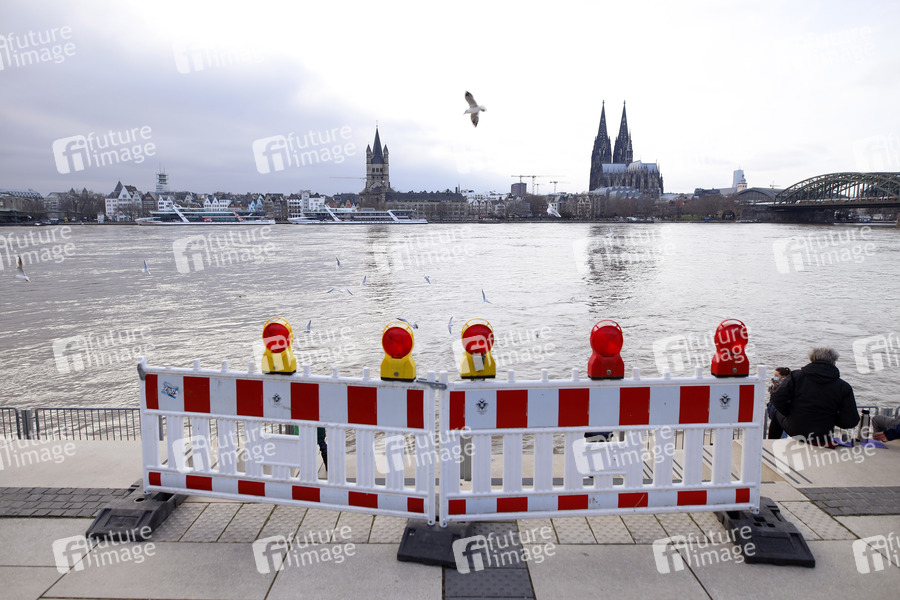 Der Kölner Rheinpegel steigt und steigt. Am Sonntagabend wurde in Köln ein Hochwasser von 7,50 Meter gemessen, der Normalwasserstand liegt sonst bei 3,21 Meter. Die Schifffahrt ist bereits eingeschränkt. Am Kölner Rheinufer werden immer mehr Barrikaden errichtet und Bereiche abgesperrt. Das Wasser klettert auf Promenaden und überspült Treppen und Fähranleger. Köln, 31.01.2021