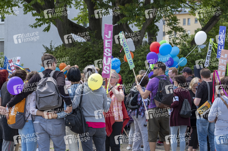 Evangelikale Christen beim Marsch für Jesus in der Innenstadt. Zeitgleich findet ein nicht ganz ernst gemeinter Marsch für Satan von Teilnehmern des 28. Wave-Gotik-Treffens statt. Leipzig, 08.06.2019