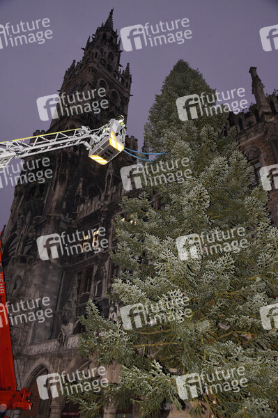 Aufstellung des Christbaums aus Steingaden auf dem Marienplatz vor dem Rathaus. München, 25.11.2020