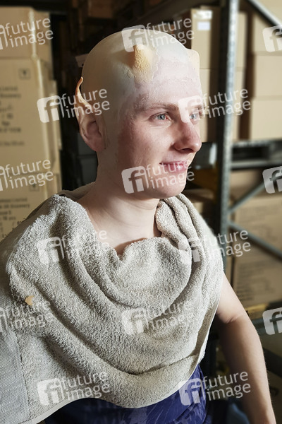 GEEK ART - Bodypainting meets SciFi, Fantasy and more: Paul Skupin beim Schminken für das UFO Photoshooting in Filmwelt Center Lager. Bakede, 24.08.2019 - Ein Projekt des Fotografen Tschiponnique Skupin und des Bodypainters und Transformakers Enrico Lein