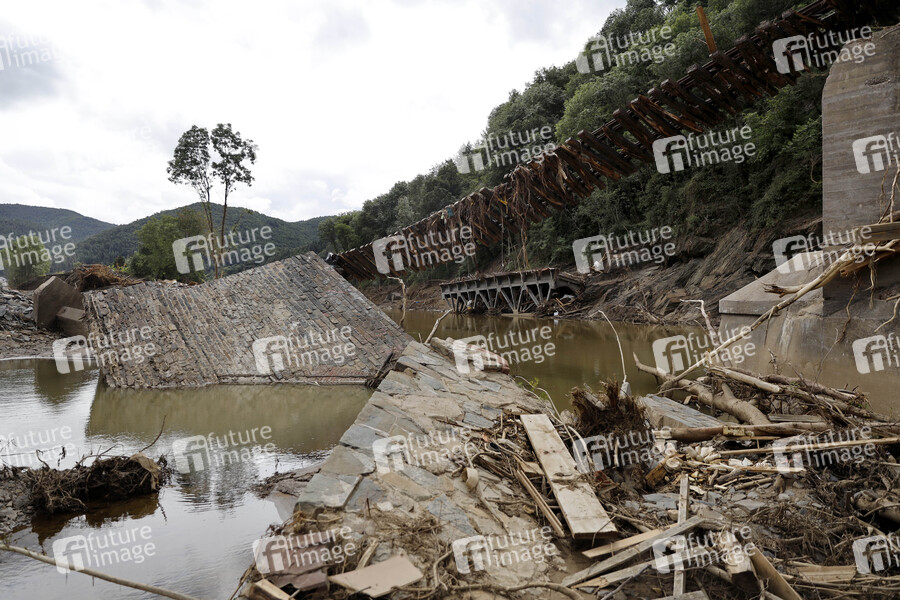 Nach dem Jahrhunderthochwasser in der Eifel durch heftige Regenfälle und Dauerregen mit Überschwemmungen und Überflutungen haben die Aufräumarbeiten im Ahrtal große Fortschritte gemacht. Einheiten von Polizei, THW, Bundeswehr und Feuerwehr mitsamt vielen freiwilligen Helfern haben Straßen geräumt, Schutt und Schlamm entfernt und die Menschen versorgt. Der Wiederaufbau wird trotzdem Jahre dauern. Im Bild Flutschäden an einer Brücke zwischen Rech und Mayschoß, die durch die Flut beschädigt wurde, 08.08.2021
