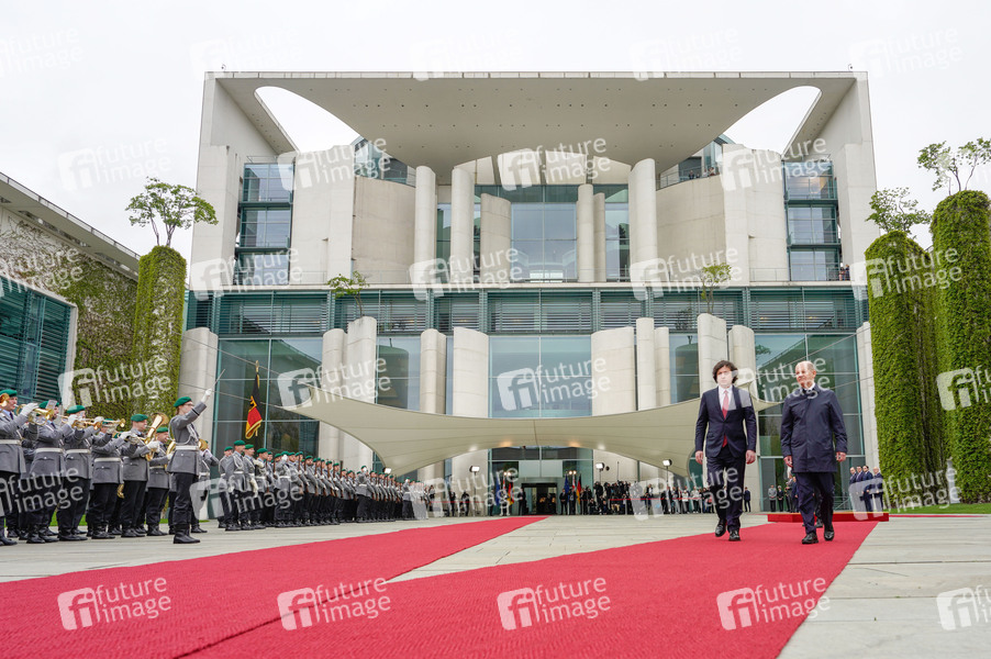 Irakli Kobachidse und Olaf Scholz beim Empfang des Premierministers von Georgien mit militärischen Ehren und zu einem gemeinsamen Gespräch mit dem Bundeskanzler mit anschließendem Pressestatement im Bundeskanzleramt. Berlin, 12.04.2024