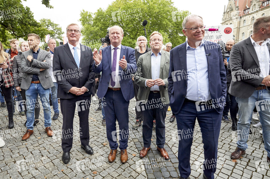 Bernd Althusmann (Niedersächsischer Minister für Wirtschaft, Arbeit, Verkehr und Digitalisierung), Reinhold Hilbers (Finanzminister von Niedersachsen), Tilman Kuban (Bundesvorsitzender der Jungen Union), Stephan Weil (Ministerpräsident von Niedersachsen) bei einer Demonstration des Bäckerhandwerks in Niedersachsen gegen hohe Energiepreise auf dem Trammplatz vor dem Neuen Rathaus. Hannover, 14.09.2022