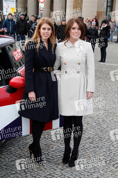 Die Prinzessinnen Beatrice und Eugenie mit einem Mini Cooper unterwegs auf einer Werbetour für ihre britische Heimat am Brandenburger Tor, Berlin