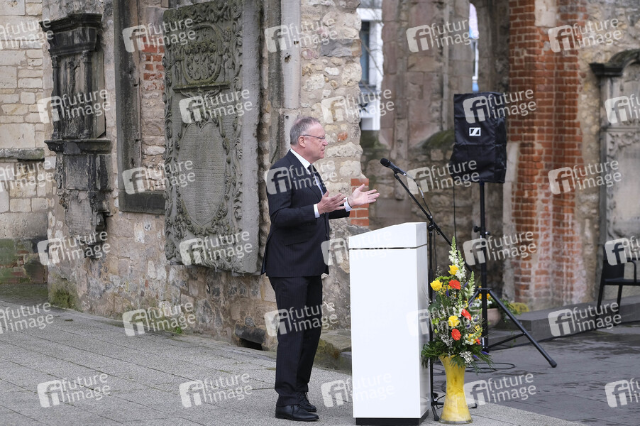 Stephan Weil bei einer Gedenkzeremonie für die Verstorbenen in der Corona-Pandemie vor der Nikolaikapelle an der Goseriede. Hannover, 18.04.2021