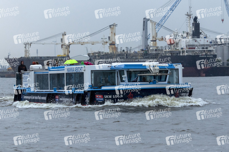 Starke Regenfälle und Gewitter sorgen diesen Sommer vermehrt für Unwetterwarnung: Touristen mit Regenschirmen auf einer Barkasse an den Landungsbrücken im Hafen. Hamburg, 14.08.2024