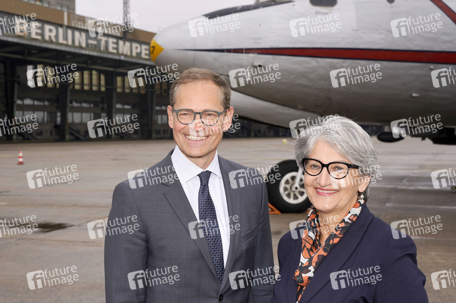 Michael Müller und Jutta Heim-Wenzler beim Fototermin bei der Programm-Pressekonferenz zum 'Fest der Luftbrücke' vor dem Flughafenrestaurant des Flughafen Tempelhof. Berlin, 29.04.2019