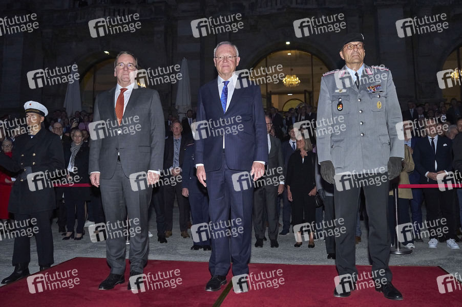 Boris Pistorius,Stephan Weil und Oberst Dirk Waldau bei der Serenade zu Ehren von Ministerpräsident Stephan Weil zu dessen Rückzug aus der Politik vor dem Gartensaal vom Neuen Rathaus. Hannover, 19.05.2025