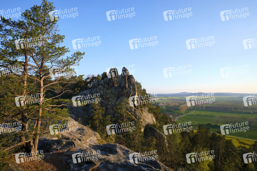 Hamburger Wappen oder Drei Zinnen ist ein besonders markantes Felsgebilde der Felsformation Teufelsmauer. Timmenrode, 08.05.2021
