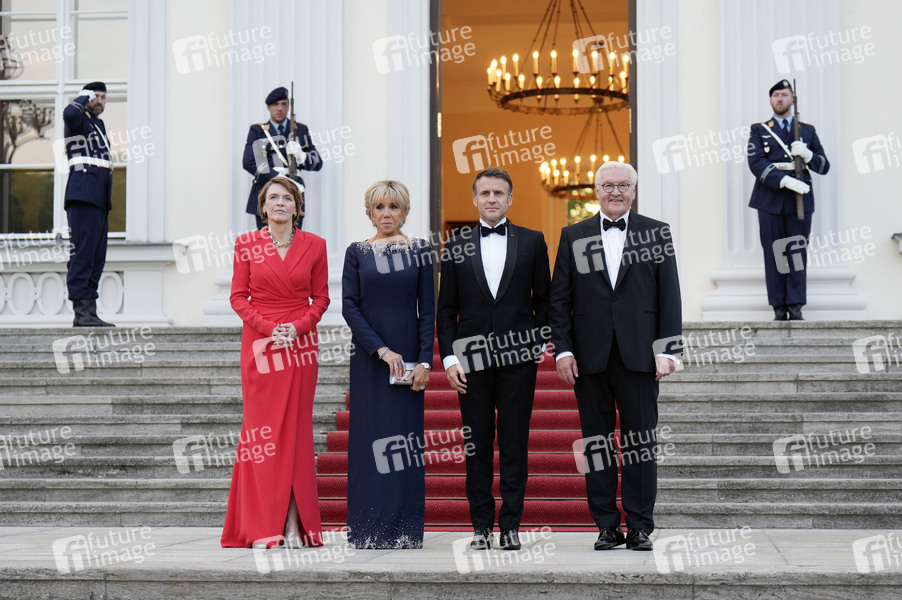 Elke Büdenbender, Brigitte Macron, Emmanuel Macron und Frank-Walter Steinmeier bei der Ankunft zum Staatsbankett zu Ehren des Staatspräsidenten der Französischen Republik im Schloss Bellevue. Berlin, 26.05.2024