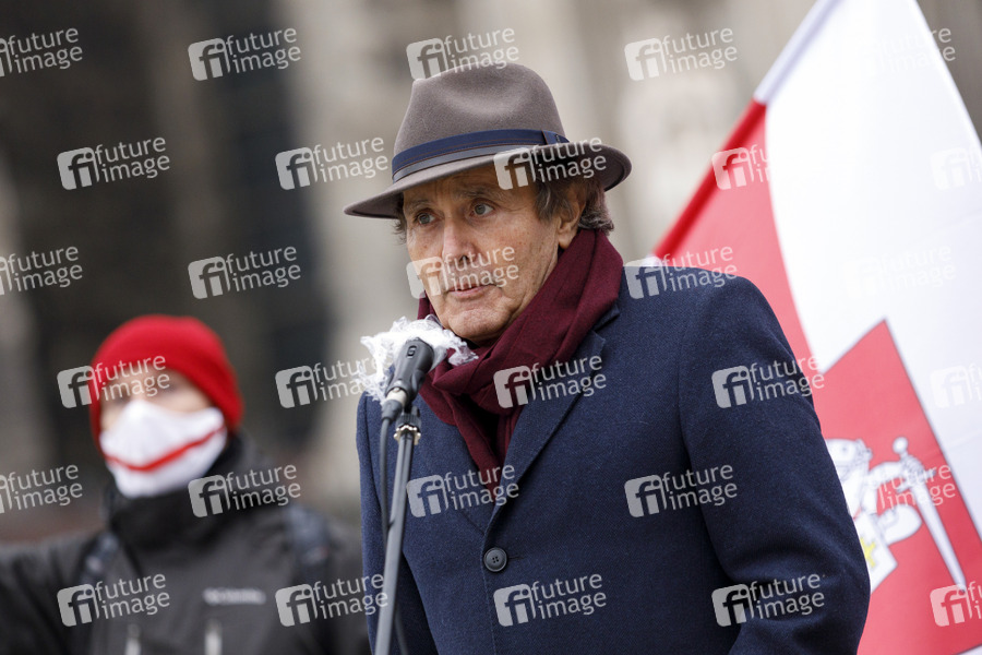 Hermann Krause spricht vor Demonstranten der 'Kundgebung für Demokratie in Belarus', die wegen Corona mit Mundschutz auf dem Roncalliplatz gegen Lukaschenko und das Vorgehen der Regierung in Weißrussland gegen die Opposition protestieren. Köln, 22.11.2020