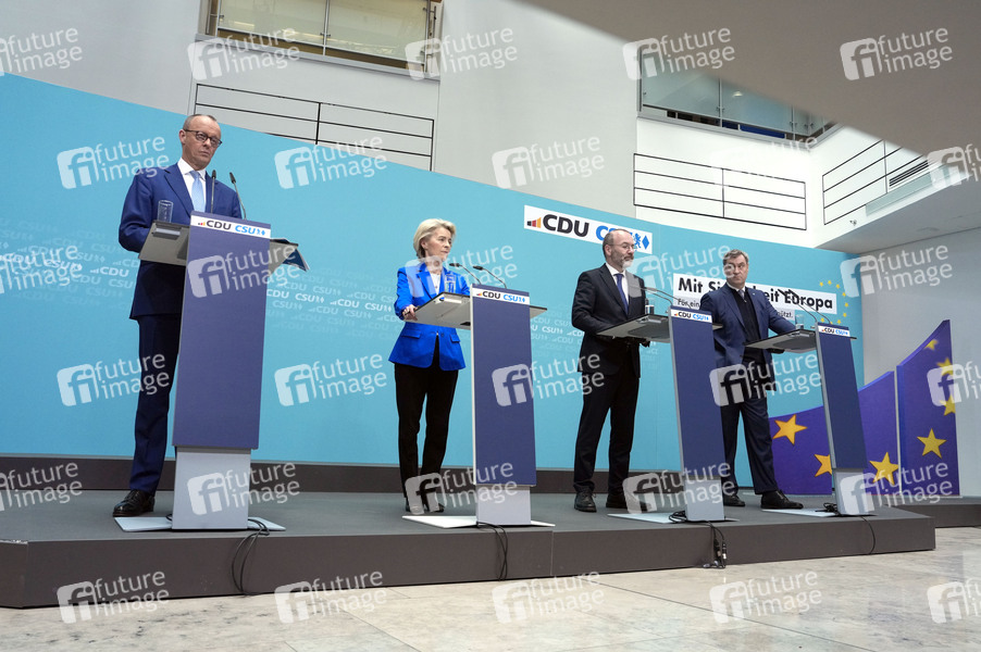 Friedrich Merz, Ursula von der Leyen, Manfred Weber und Markus Söder bei der Sitzung der Präsidien der CDU und der CSU zum Europawahlprogramm im Konrad-Adenauer-Haus. Berlin, 11.03.2024