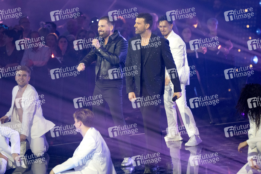 Eloy de Jong und Jay Khan von Boyband Mania in der TV-Show 'Silvester-Schlagerbooom 2026 live - Die Wunderlichtershow!' im BMW Park. München, 31.12.2025