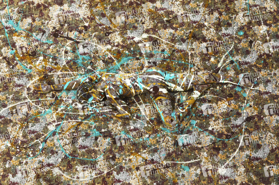 Bodyart-Künstler Jörg Düsterwald realisiert zum Thema 'Vielseitigkeit' mit verschiedenen Fotomodell-Typen eine Kunstwerk-Serie. In den Produktionshallen des kooperierenden Unternehmens Vorwerk flooring in Hameln hat er das Schwarze Model Clémentine passend zum gesponserten Bodenbelag mit einem Bodypainting versehen und anschließend flüssige Farbspuren aufgetragen.