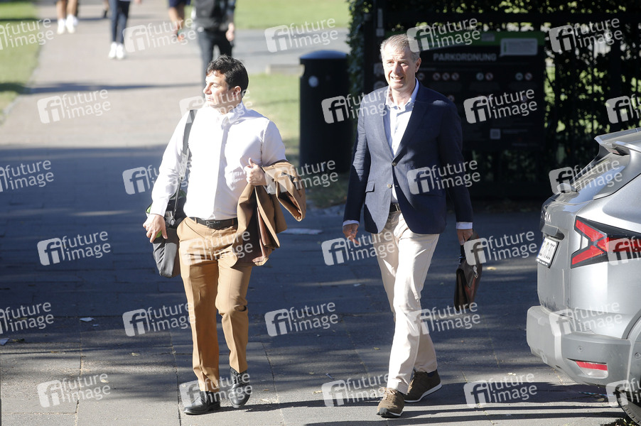 Stephan Hensel, Ex-Ehemann und Vater der Kinder von Christina Block, mit seinem Anwalt Philip von der Meden bei der Ankunft zum Prozess wegen mutmaßlicher Kindesentführung gegen Christina Block am Landgericht Hamburg. Hamburg, 19.08.2025
