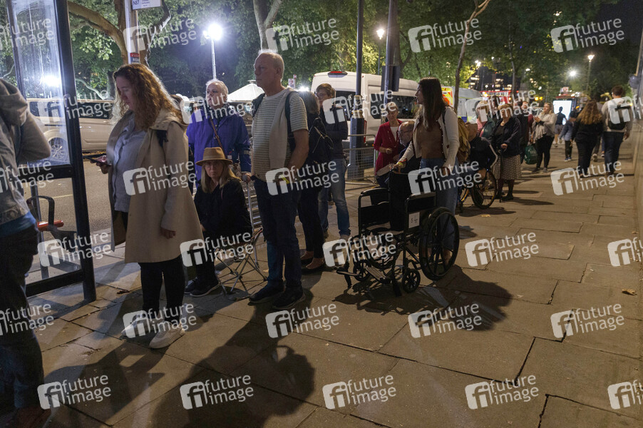 Menschschlange vor dem Londoner Parlament. Seit dem frühen Mittwochabend ist die Westminster Hall, in der der geschlossene Sarg der Queen aufgebahrt ist, durchgehend für die Öffentlichkeit geöffnet, damit sich die Landsleute von der gestorbenen Queen Elizabeth II verabschieden können. Schon zu Beginn zog sich eine Warteschlange etwa vier Kilometer weit durch das Zentrum der britischen Hauptstadt. Es wird mit Wartezeiten von bis zu 30 Stunden gerechnet. Angesichts der langen Wartezeit stehen Hunderte Helfer, Polizisten und Sanitäter bereit. Der Leichnam der Queen soll noch bis zur Trauerfeier am 19.09. aufgebahrt bleiben. London, 14.09.2022