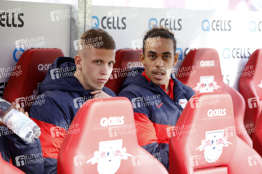 Dani Olmo und Yussuf Poulsen beim Fußballspiel RB Leipzig - Bayer 04 Leverkusen ( Endstand 1:1 ) am 24. Spieltag der Fußball-Bundesliga in der Red Bull Arena. Leipzig, 01.03.2020