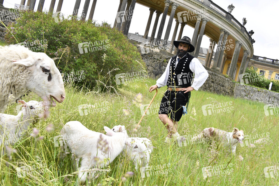 Schäfer Alex Beer bei der Ankunft der Schafe für die Beweidung von Wiesenflächen im Park Sanssouci. Potsdam, 19.05.2020