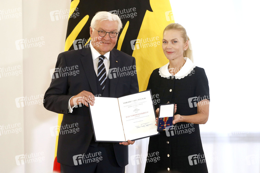 Frank-Walter Steinmeier und Anna Loos bei der Verleihung des Verdienstkreuzes am Bande der Bundesrepublik Deutschland an Anna Loos im Schloss Bellevue. Berlin, 01.10.2025