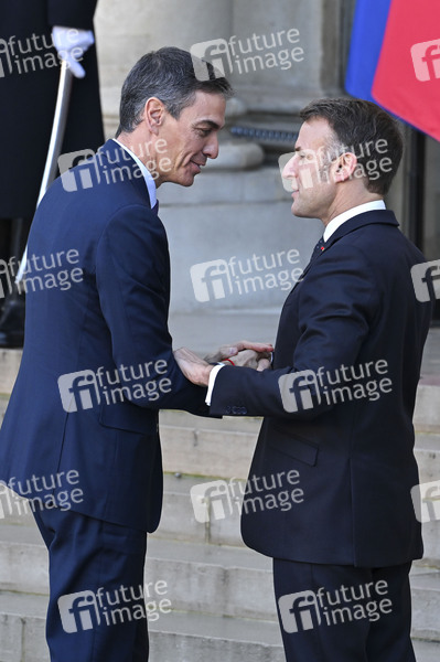 Pedro Sanchez und Emmanuel Macron beim Treffen der Koaltion der Willigen zu Beratung über die militärische Unterstützung für die Ukraine im Élysée-Palast. Paris, 06.01.2026
