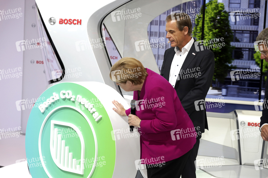 Politikerin, Bundeskanzlerin der Bundesrepublik Deutschland, Vorstand Bosch, Auto, Kfz, Pkw, Fahrzeug, Messe, Fair, Ausstellung, Automobilfachmesse, Frankfurt Motor Show, IAA Frankfurt, Technik, Internationale Automobil-Ausstellung, Verband der Automobilindustrie, VDA