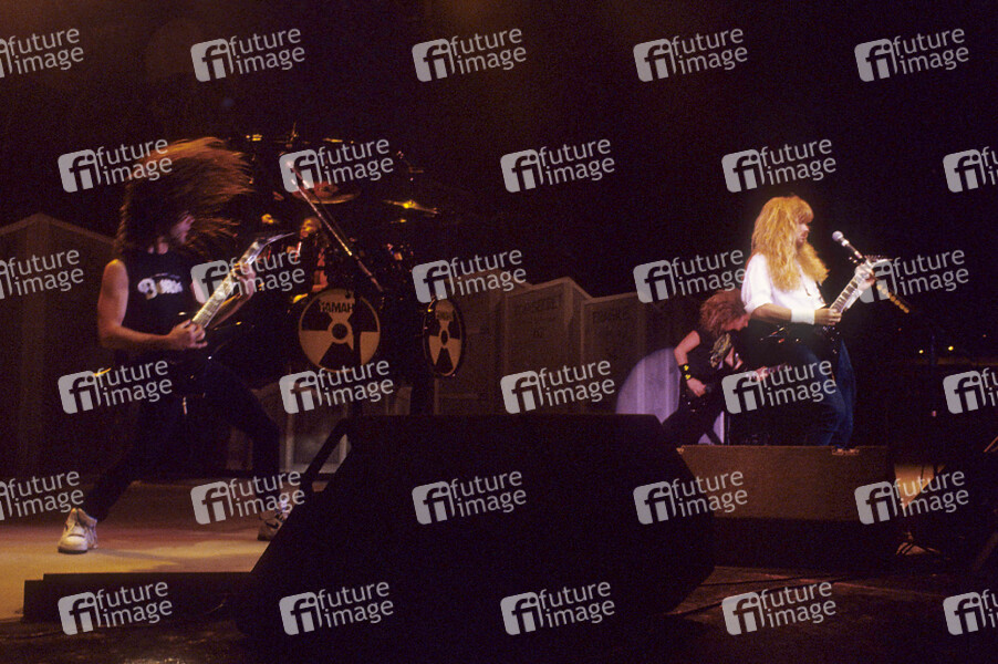 Marty Friedman, Nick Menza, David Ellefson und Dave Mustaine von Megadeath live bei einem Konzert der 'Oxidation Of The Nations'-Tour im Hammersmith Odeon. London, 26.03.1991