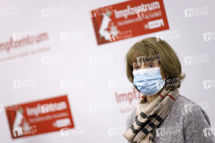 Henrietter Reker auf der Pressekonferenz: Der NRW-Justizminister auf Werbetour in Köln für die Kampagne des Weissen Rings zum Thema 'Kein Anschluss für Betrüger am Telefon' im Impfzentrum in den Messehallen. Auch dort sollen Plakate die alten Menschen vor der Enkeltrick-Masche warnen, die ohnehin die Messehallen für einen Impftermin aufsuchen. Köln, 05.02.2021