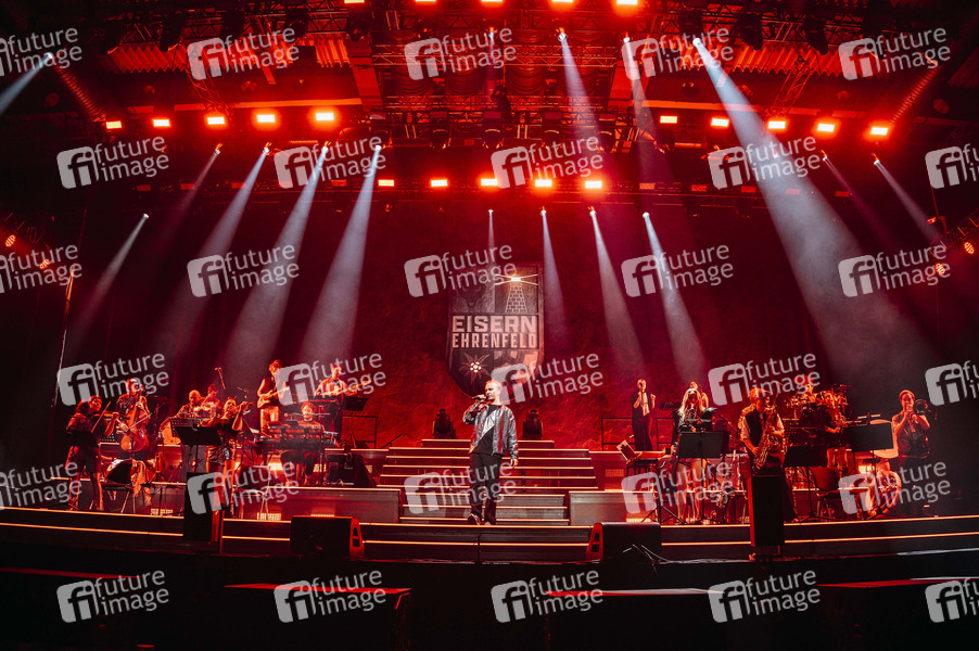 Jan Böhmermann und das Rundfunk-Tanzorchester Ehrenfeld live bei einem Konzert der 'Eisern Ehrenfeld'-Tour in der Messehalle. Erfurt, 15.01.2025