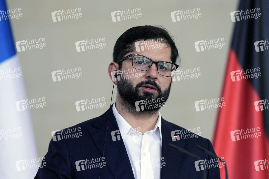 Gabriel Boric beim Empfang des Präsidenten von Chile mit militärischen Ehren und zu einem gemeinsamen Gespräch mit dem Bundeskanzler mit anschließendem Pressestatement im Bundeskanzleramt. Berlin, 10.06.2024