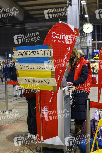 Mitarbeiter der Caritas empfangen Geflüchtete aus der Ukraine am Münchner Hauptbahnhof. München, 06.03.2022