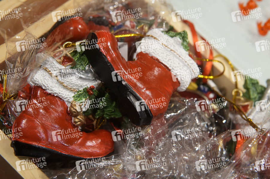 Rote Stiefel-Weihnachtsbaumanhänger auf dem City-Weihnachtsmarkt an der Gedächtniskirche auf dem Breitscheidplatz. Berlin, 16.12.2024