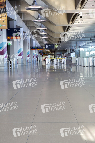 Menschenleere Check-in-Schalter - Nahezu vollständiges Erliegen des Personenflugverkehrs im Zusammenhang mit der Corona-Krise am Flughafen Köln/Bonn. Köln; 07.04.2020