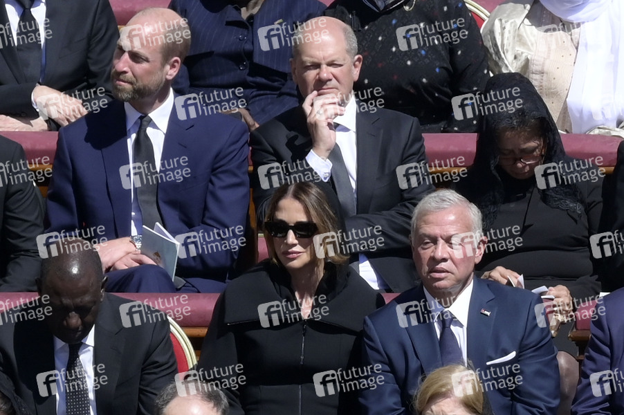 Olaf Scholz, Rania von Jordanien und König Abdullah II. bin al-Hussein bei der Trauermesse für den verstorbenen Papst Franziskus auf dem Petersplatz. Vatikanstadt, 26.04.2025